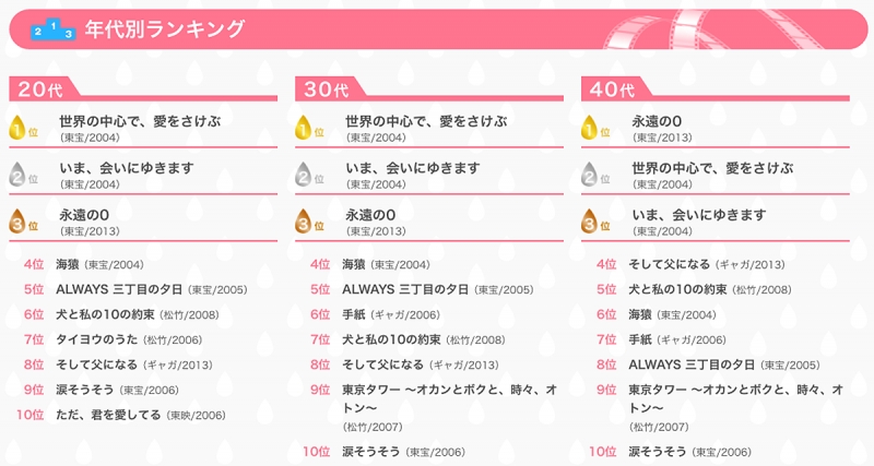 3000人の20代-40代の女性が選んだ「涙が止まらない映画ランキング(参天製薬)」によると、20代と30代で1位、40代では2位の「世界の中心で、愛をさけぶ(東宝/2004)」が【総合1位】とのこと。素直に嬉しいな、この映画は撮影支援担当の私にとっても忘れられない1本です。
