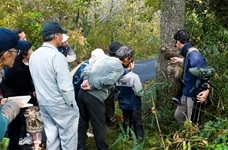 木になっている実がカロリーが高く鳥たちが好むのでこの木を目印に鳥を観察するのにいい事、虫が越冬の準備をしているところなどの説明。森から聞こえる鳥の泣き声が実は春とは違ううぐいすである事も確認。