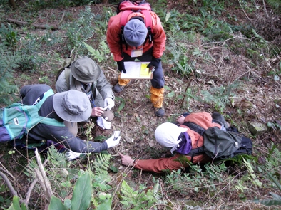 帰り道(?)は、尾根筋の作業道から、ほとんど直線の獣道を下る。かなりきついコースで、やはり1人が足を滑らせた。手近な植物をつかんで立ち直ったものの、「痛いっ、つつ!」。つかんだのは、とげのある小さな山椒の木だったのだ。「この、このっ、このっ」と山椒の木に八つ当たりする。歳をとると、子どもに還るってほんとうかもしれない。