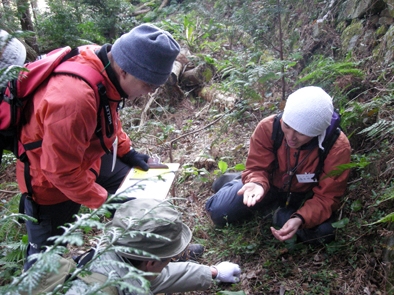 宇和島城、宇和島駅、どちらからも直線距離で1km弱。天神小学校裏手の山がフィールドだった。朝9時、天神公民館に集まった面々は、先生の海田さんとコーディネーターを除くと、平均年齢70歳近い3人。