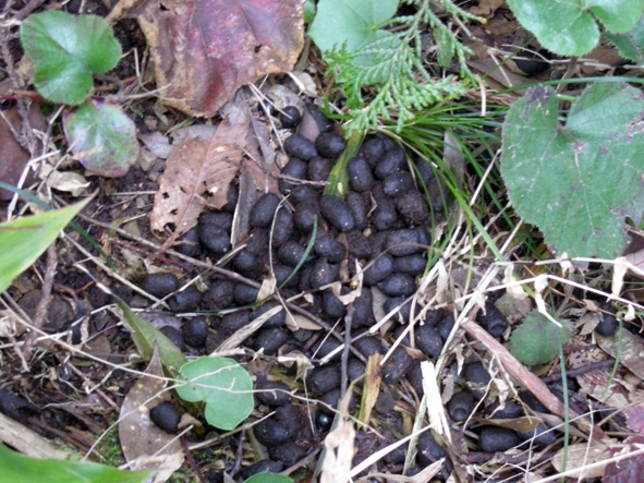 天神公民館から小学校脇を通り、民家を抜けると、裏山への登り口だった。宇和島城を望み、すぐ下には伊達家の墓所も見える。道路を外れて、チョコッと5mほど山の中に入る。「あった!」。シカとウサギ、タヌキのフンが見つかった。こんなところで、と思うくらいだ。