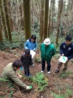まず、歴史館の裏手の山道で、生き物がいそうな土壌をトレイに採取します。