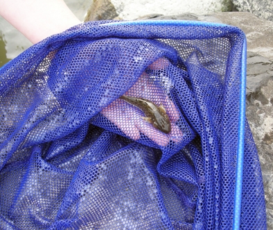 でも、あたりはこれだけ。そこで、網で小魚を捕ることに。子どもたちはすごいです。半ズボンで川の中ほどまで入り、ヌマチチブが7尾とヨシノボリが1尾、若干の水生昆虫を捕獲しました。仕掛けておいた「ハヤ瓶」は、うろうろしていたコイが片っ端からひっくり返してしまって、採集成果はゼロでした。それでも、子どもたちも満足していたようです。