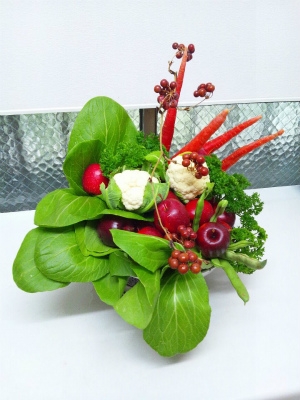 この授業のことを知る少し前に、「野菜のいけばな」という言葉を耳にしていました。いけばなさえやったことがない自分にできるのか、不安を抱きつつ、でも、このチャンスを逃したら体験できないかもしれないと思い、申し込みました。当日はステキな先生2人のもと、隣の人とあれこれお話しながら、楽しく「野菜のいけばな」をして、あっという間に時間が過ぎていきました。先生にお手本を見せて頂いた後、各自がいけるという流れだったのですが…最初は野菜を前にしても、どうしたらいいのか、イメージもわかず、キョロキョロしながら、周りの人を見てみたりしていました。でも、野菜を手にとって、器に入れていくうちに、少しずつ隙間を埋めていく感じで、なんとなく形になっていきました。終わりの方は、楽しくなっている自分がいて、不思議な感覚でした。ある程度、みんな同じような野菜を使っていけたわけですが、それぞれがまったく違うものを創り上げたということが感激でした。答えがないとは、こういうことなんだろうと思います。みんな、こだわりや表現したいことがあって、それをうまく野菜で形にしていました。「野菜のいけばな」は野菜を食べることを前提としています。食べる前の「愛でる」という時間です。食べる前に、色がキレイとか、形がかわいいとか、いい香りがするとか、味覚以外で野菜を感じることで、野菜に親しみや愛着を感じることができます。子どもたちの食育という観点ではもちろんですが、大人こそがもっと食べる物に興味関心を持つべきなのかもしれません。「野菜のいけばな」というものの他に大切なものをいろいろ学べた授業でした。先生、スタッフのみなさま、参加されたみなさま、ありがとうございます。【授業報告:鎌田麻衣】