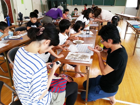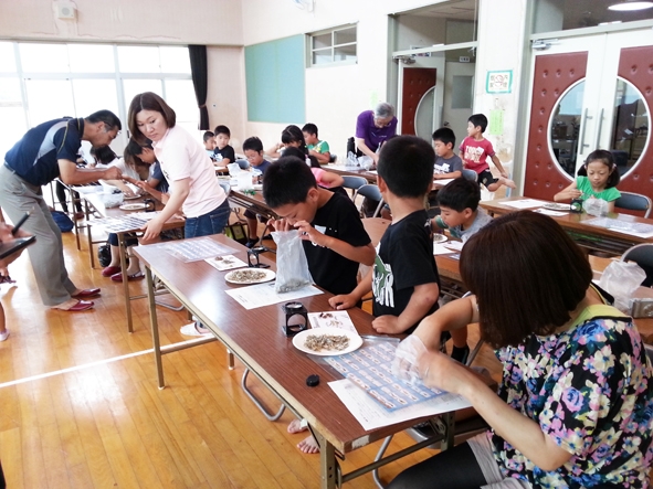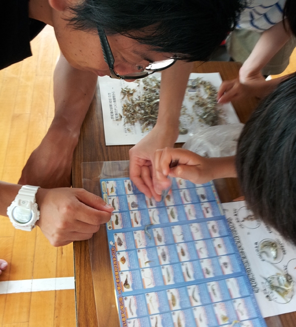 見つけたチリモンの種類を調べるために写真や見本と見比べるも、なかなか判別が難しく、子ども達から「先生、これ何? 何の生物?」と、松井先生は引っ張りだこで大忙しの様子でした。保護者の方も、子ども達と一緒になってレアなチリモンを見つけるべく、一生懸命探しておられました。