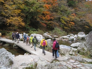 その後、渓谷沿いを散策しました。モミジやツタウルシ、ブナなどの紅・黄葉には少し早い時期でしたが、両岸に広がる広葉樹の林はその周りにある人工林の森と比べ、なんと明るいことか! 解放感を楽しみました。語学の先生が自分の国と同じような風景だと感傷にふけっている姿を見て、ニュージーランドには日本のように徹底した人工林の森は少ないことを知り、山の保全、利用のし方を考える機会になりました。