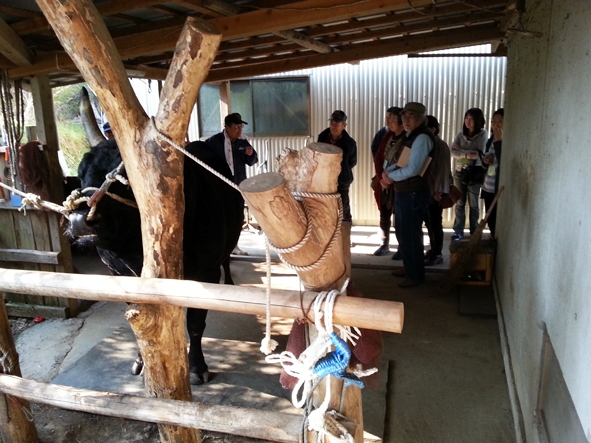 続いて、後半はお待ちかねの牛舎見学です。初めて見る闘牛〈方因坊〉はすごい迫力で、思わず後ずさり…。方因坊も大勢の人にビックリしたのか、「モゥー!」の一声。散歩では、2本ある手綱のうち1本を持たせてもらいました。横を歩く私のことをチラッチラッと気にしながら歩く方因坊。その仕草がとても愛らしく、すぐにファンになってしまいました。