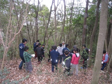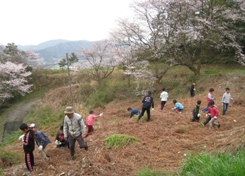 山奥組の皆さんが出迎えてくれ、初めに十文字田の里山の説明をしてくれました。次に山を歩きながら里山の木の種類や植物の名前、特徴を教えてもらいました。『カゴノキ』は初めて知りました。その後、食べられる山菜を採りに行きました。タンポポ、よもぎ、わらびなどを摘み、バッタを見つけて子供はうれしそうでした。