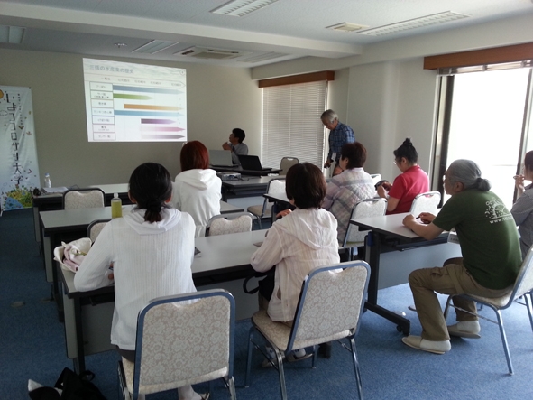 潮彩館のすぐ近くにあるみかめ本館の5階での、最初の授業は「奥地あじ」でした。三瓶湾は、海図では奥地湾となっていることから命名したそうです。先生の宇都宮一彦さんから回遊のアジではなく瀬つき(岩礁にすんでいる)のアジだから脂がのって、金色に輝いていると説明を受け、「フンフン」と思っておりましたが、東京の三越本店で1尾ン千円とうかがい、眼が・になるほど驚きました。