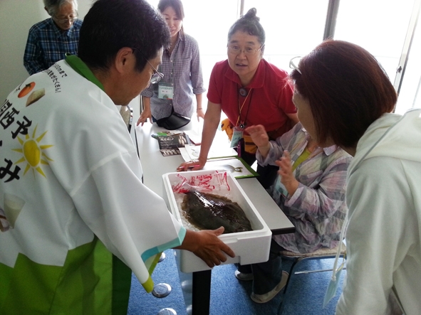 ついで、「ハーブ媛ひらめ」の養殖について、山口正幸さんのお話。「ハーブ媛ひらめ」といっても、「みかんダイ」のようにハーブの香りがするわけではなく、癖のない味になるそうです。このひらめは陸上養殖されており、飼育はコントロールしやすいけれど、設備投資がたいへんだということでした。タイやハマチ養殖の次を狙って、ブランドに育てるという意気込みが感じられました。このような養殖も、リアス式海岸の三瓶湾だからできるということです。