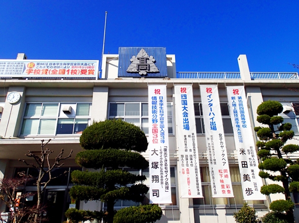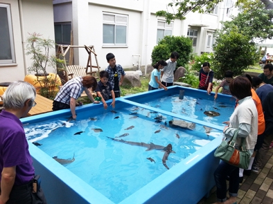 最初にたずねた長浜高校の水族館は、重松先生のお話の上手さに乗せられて、すっかり長浜高校水族館ファンになりました。長浜高校がニモ(カクレクマノミ)で有名なのは、以前から新聞などで見聞きしていましたが、他にも肱川水系の淡水魚から長浜周辺の海の魚、宇和海や沖縄付近のカラフルな熱帯魚をたくさん見せてもらいました。校庭の大きな水槽にはタコ、イカ、アメフラシ、ヒトデ、別の水槽には小型サメ(私たちは子供のころ、ノークリと呼んでいましたが)などがいて、手で触ることができました。