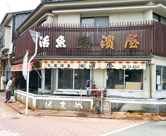 この日の私の目的はこれで“達成”しましたが、授業はそのあともつづき、天然活魚店主・浜田さんのお店をたずねました。「まちなか水族館」として、生簀(いけす)に飼っている魚の話や、この生簀のために海水をくみ上げていること、魚などによって好みの塩分濃度が違い、別の水槽に分けて入れていること、釣った直後よりも生簀で1日以上おいたほうが、身が引き締まっておいしいことなど、ほんものの水族館では聞けない話を聞くことができました。