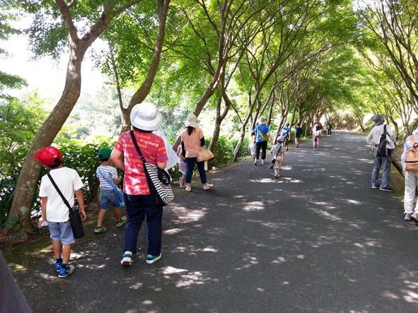 先生の松田さんが、今日のセミのぬけがら集めについてお話しされたあと、さあ出発。竜王公園の長い長いフジ棚の道を、セミのぬけがらを探して歩く。初めのうちは、みんなの目が慣れなくてなかなか見つからない。やがて、ひとつ見つけ、二つ見つけしているうちに、子どもたちは夢中で探しはじめる。探検隊の列が長く伸び、お母さんたちまでも、先に立ってぬけがらを集める。ぬけがらを入れたフィルムケースがどんどん増えてきた。