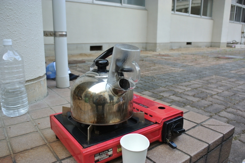 水を飲めるようにする方法は、ろ過、蒸留、煮沸などがあることを学びました。そして、蒸留実験を通して、海水から淡水を取り出すことを中庭に移動し行いました。海水の入ったヤカンを火にかけ、ヤカンの口に耐熱コップをセットし、外気に冷まされた水蒸気が、水滴になりそれを集めました。一滴一滴、なかなか貯めるには時間がかかりましたが、貴重な飲める水のありがたさを感じる授業でした。