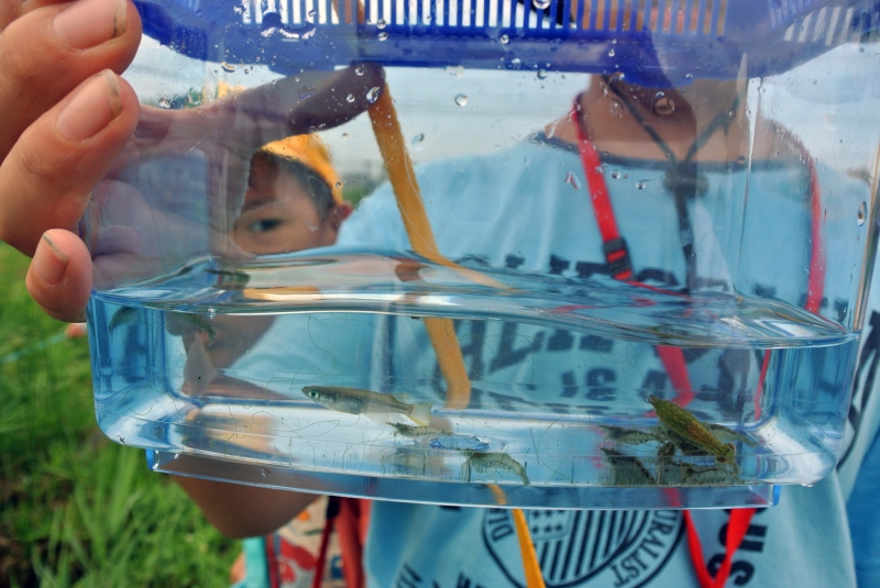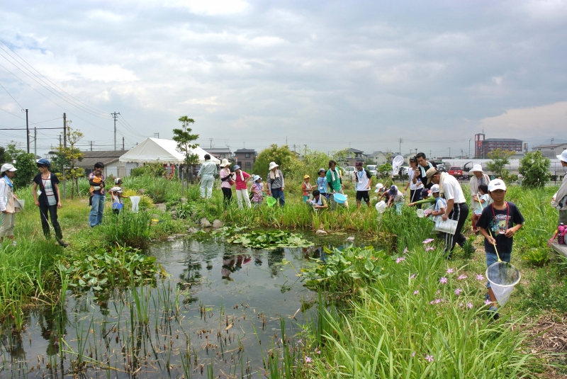 松前町が主催する「子ども環境学園」と共催で実施されたため、子ども環境学園の参加者を含め、大勢の方が参加していました。子ども達は草引きが終わると早速、網やカゴを持ってビオトープ内の池や小川に生息するメダカやドジョウ、バッタやトンボなどを観察。分からない生物がいると平井先生を尋ねては質問する姿が微笑ましたかったです。