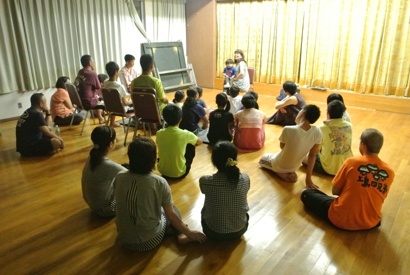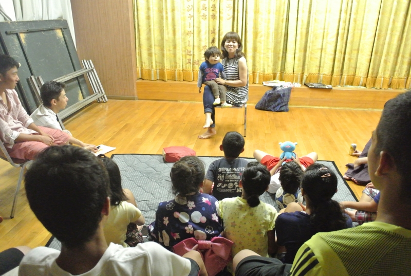 8月14日(木)、次の日に控えた魚島テンテコ踊りの前夜祭に参加し、身も心も熱くなった後に、おはなし屋えっちゃんこと武知悦子さんの怪談絵本を聞くことが出来ました。えっちゃんさんの話をお聞きするのは初めてであり、さらに怪談話ということで、以前からすごく楽しみでした。