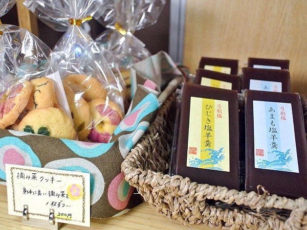 テーブルの上には、ずらりと並んだ弓削島の特産品。「弓削塩」、「ポリポーリ」、「しまドレ」、「天然ひじき」、「摘み菜クッキー」、「塩羊羹」等々…。どれも美味しそう。そして、ユニークで優しい感じがします。