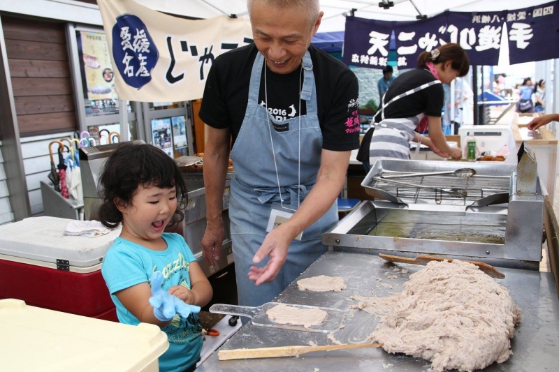 今回の教室は八幡浜市。西日本一の魚市場を有し、毎日のように新鮮な魚が水揚げされる魚の町。市内には「じゃこ天」や「かまぼこ」を作るお店や工場も数多くあります。その中の一軒、地元の商店街の「八日市」では、できたてのじゃこ天を求めて行列ができる、まさに市民の味「くずし鳥津」でのじゃこ天づくり体験です。