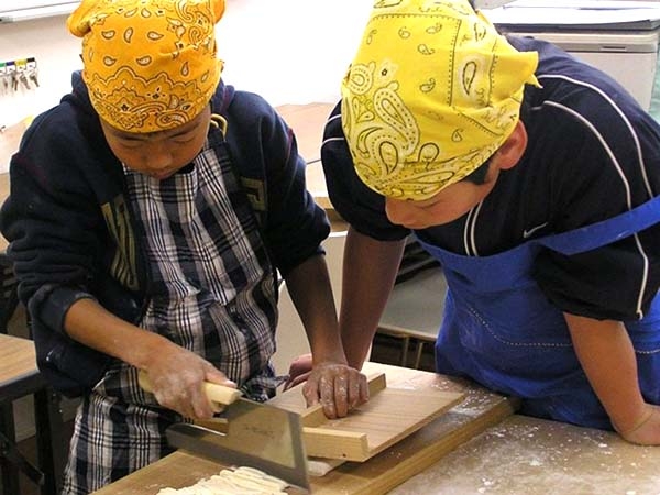 国土交通省発表の全国モデル「道の駅」に選定された「道の駅内子フレッシュパークからり」で、うどん打ち体験。からりは買い物だけではありません。本授業は、からりに集う生産者の集まり「からり農産加工施設運営協議会」が先生です。普段の仕事内容などを聞きながら、美味しい授業です。