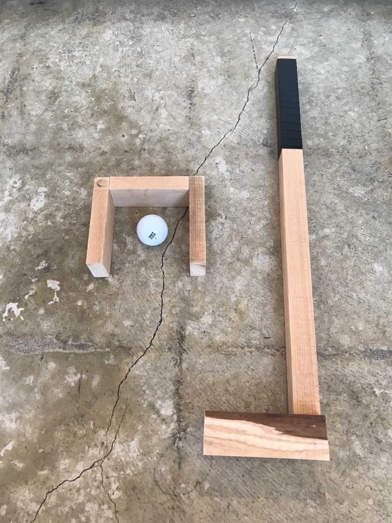 パターゴルフセットは、シャフト(手で持つところ)とヘッド(ボールを打つところ)の長さや大きさを自分好みに角材をカットしてビスで固定。カップ(ボールが入るゴール)は、お家の中に穴を掘るわけにはいかないので角材をコの字型に組合せてゴールにします。