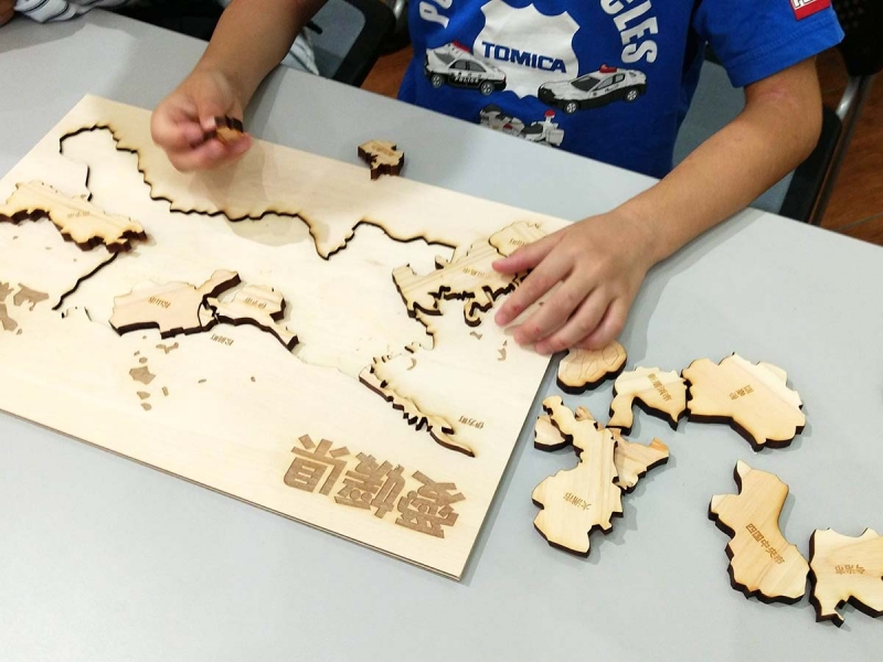 愛媛県には20市町があり、各市町の名称は言えると思いますが、それぞれの位置関係は意外と覚えていないものです。そこでパズルであれば楽しみながら、それも木工体験を伴えば一層学べると思った狙いは的中し、予備を含めた40個の「えひめ県パズル」は2日間で全て出尽くしてしまいました。