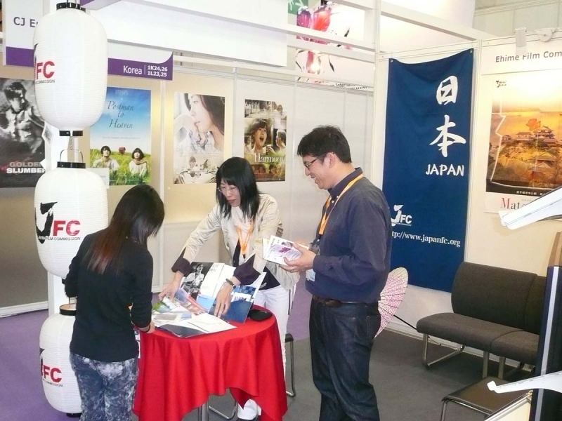 そんなJFCは何をしているか?というと、国内での撮影環境の向上を図ると共に、「海外作品の撮影支援」「海外での日本のロケ地紹介」などがあります。写真は「香港フィルマート」での様子。映画祭と併設で行われる「作品の売買機会」で「日本のロケ地」を紹介してます。ちなみにこの写真の後ろには「Ehime Film Commission」として「Matsuyama」を紹介しています。