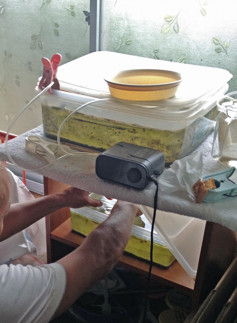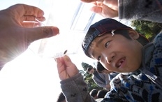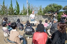 「カブちゃん先生ですよ〜」カブトガニのお面をかぶった河村先生の笑顔に、子供も大人も思わず身を乗り出した授業のスタートでした。カブトガニ、大きくなったものは、東予図書館で見たことがあったのですが水槽にいたのはかわいい赤ちゃんたちでした。エサをやるために泥の中からとりだすのも、傷つけないようにそ〜っとすくって、透明の水の入ったガラスの器にうつします。「久しぶり〜って感じで、みんなが集まってお相撲をしたりするんだよ。」と先生がおっしゃった通り、仲間同士が集まって小さな手足を一生懸命動かして、何やらコミュニケーションをとっているような姿は本当に微笑ましく、子供たちも必死で覗き込みます。そのカブトガニたちにエサをやるのを見ながら、クイズを交えた先生の解説が始まりました。カブトガニは、2億年以上前から同じ姿だそうです。それは、寒さに強い身体そして、身体に栄養を蓄えるしくみがあるため、1年間何も食べなくても大丈夫な身体を持っているからだそうで、あんなに大きな体の恐竜たちが息絶えた中でも、ずっと生きてきて、進化をする必要もなかったそうです。そして、このことに先生もとても感動したそうです。彼らは脱皮をしながら成長するそうなのですが、そのぬけ殻も大切に保管してあり見せて下さいました。小さなしっぽや手足の形まで、そのまま細かい形が残っている抜け殻…そう、セミの抜け殻のように立体的で透明で、皆で光に透かして見たりして、その美しさを楽しませてもらいました。河村先生は、今年の1月に10匹の赤ちゃんカブトガニを飼いはじめて、8匹も生き残っているのはめずらしいそうです。その2匹亡くなってしまったカブトガニのことも、「僕の扱いが悪かったかも…と自分を責めることもあるんですよ」と、愛情を注いで育てられている様子には、とても感銘を受けました。カブトガニの生育に適した干潟は、日本の中でも少なく、それが西条市にあるということで、もっともっとカブトガニを知ってほしい、そして干潟や自然を守りながら、これからの子供たちにも引きついで行きたい…という先生の思いがとても伝わってくる授業でした。最後に、地球が生まれて46億年。その46億年を今日までの1年に例えると… カブトガニが生まれたのは12月5日くらい、人間が生まれたのは12月31日16時だということも教えて下さいました。まだ地球上に間借りして、ほんの少ししかたっていないんですよね、私たち人間…。 こんなにいじらしく、そして強く永く生きてきたカブトガニたちや他の生き物たちと、一緒に笑顔で未来を迎えたいって…ずっと繋がっていたいって…大人も子供も青空の下で、「地球のために自分にできること」を考えるきっかけになったのではないでしょうか。 それは、ほんの少しの一歩になるかもしれませんが、積み重なって、必ず大きな一歩になると私は信じています。 河村先生、そしていよココロザシ大学の皆さん、素晴らしい授業をありがとうございました。