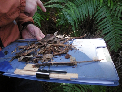 その後、裏山の獣道をたどって、生きものの痕跡を探す。といっても、雪道でもなければぬかるみでもないから、痕跡は動物のフンということになる。おおきなクスノキの根元ではムササビのフン、スギの植栽地ではシカの食害痕と大量のフン、人家(?)の跡の湿地はイノシシのぬた場、尾根筋の作業道にはイタチかテンのフン。