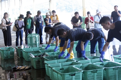さて授業当日。まず、愛南漁協の藤田さんに同漁協が運営している深浦漁港を案内していただきました。この漁港は漁師さんのために、吊り竿や釣り針をはじめ、当座に間に合わせるために発泡スチロール製のトロ箱も多品種少量で取り揃えてありました。また、冷凍庫も広く、魚の鮮度を保つための氷を提供する設備も万全で、改めてすごいなと思いました。