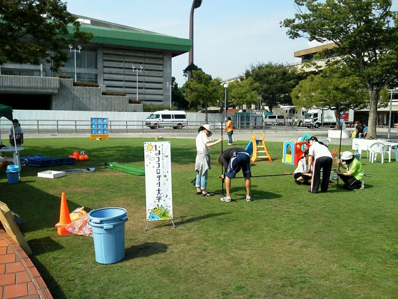 まだまだ暑い日差しの中、最初にストラックアウトやミニサッカーなどの設置準備を行いました。