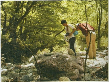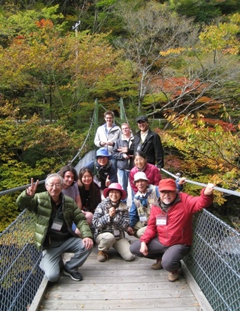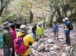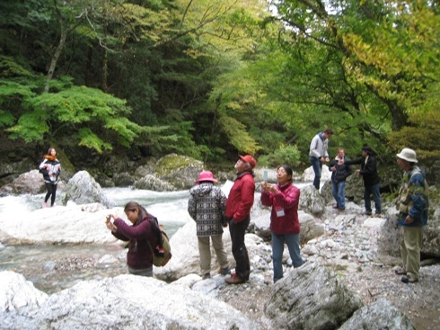 その後、渓谷沿いを散策しました。モミジやツタウルシ、ブナなどの紅・黄葉には少し早い時期でしたが、両岸に広がる広葉樹の林はその周りにある人工林の森と比べ、なんと明るいことか! 解放感を楽しみました。語学の先生が自分の国と同じような風景だと感傷にふけっている姿を見て、ニュージーランドには日本のように徹底した人工林の森は少ないことを知り、山の保全、利用のし方を考える機会になりました。