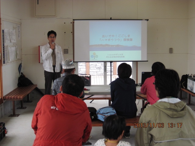 「ハマボウフウ」は海岸の砂地に自生する多年草。山菜として食用に使われるほか、漢方薬・民間療法薬として利用されてきました。興居島には「ハマボウフウ」をはじめ「ユムシ」など特産の生物があります。この授業では興居島で地元の生き物を利用してきた先人の文化の紹介と貴重な海浜植物であるハマボウフウの観察を行います。道すがら出会うさまざまな生き物についても菊原先生が解説してくれます。