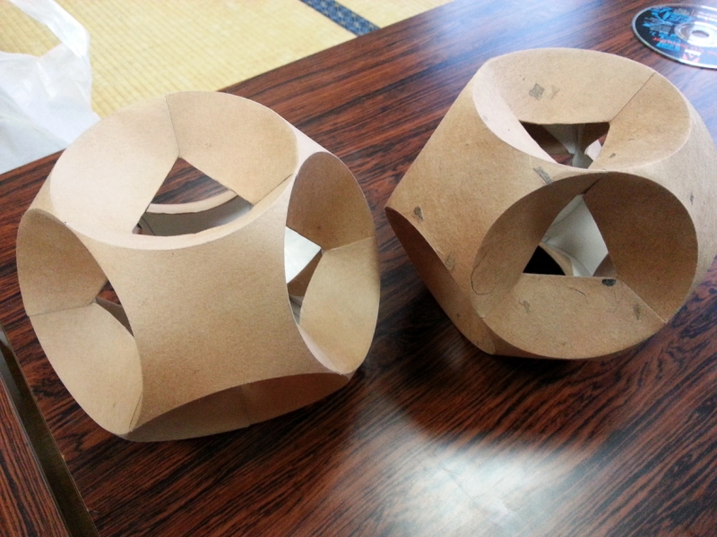 もちろん、サッカーボールのような立体造形物を平面からつくり上げるのは、大変なのですが、あらかじめ平野さんがケント紙、泉貨紙それぞれの切り口や折り目を印刷しておいてくれたおかげで、比較的容易に(というほど簡単ではありませんが)組み立てることができました。