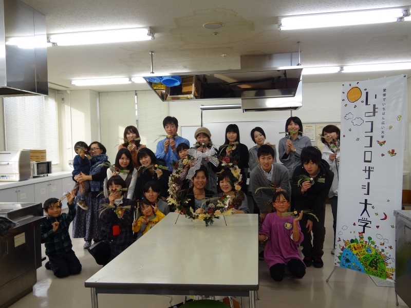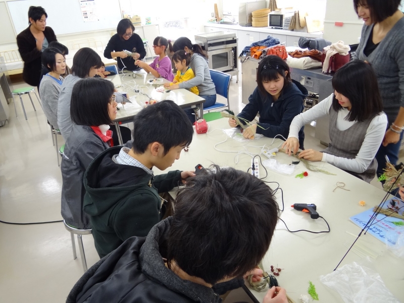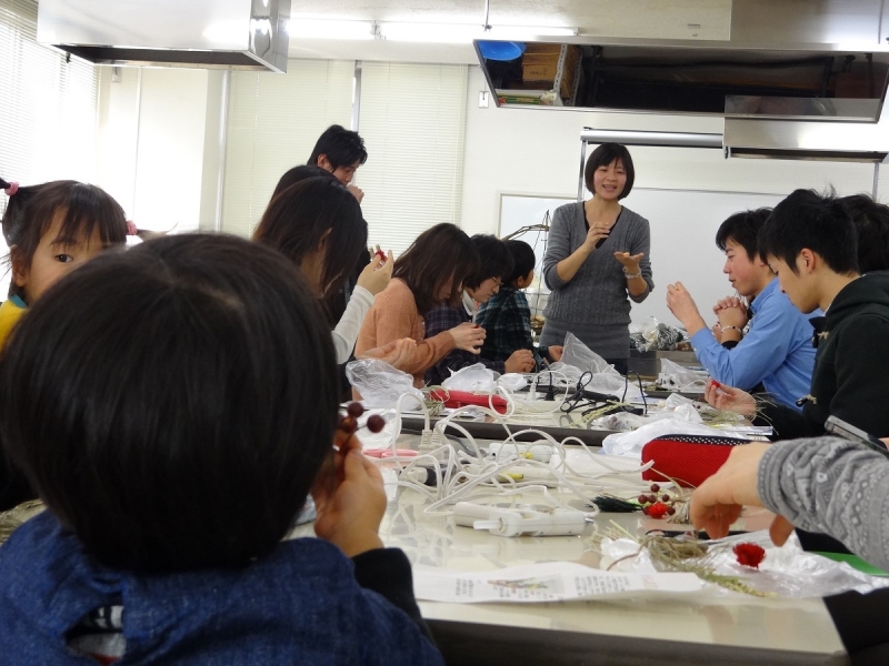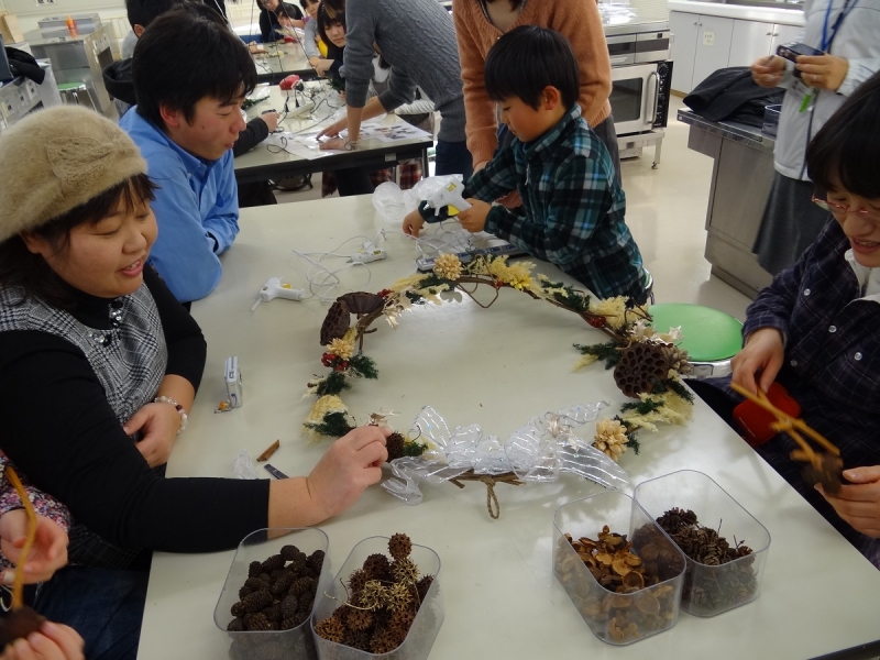 最初に作ったのは正月飾り。配られた素材をどうしようかとデザインを考える…なんとなく、イメージができたので、小学生以来ではないかと思われるグルーガン片手に、素材を組み合わせていきました。あまり図工は得意ではなかったので不安でしたが、試行錯誤しながらなんとか完成。最初に考えたデザインは無駄でした(笑)同じ素材を使ったのに、出来上がりはみんなまったく別物で、まさにオリジナルな1品となりました。