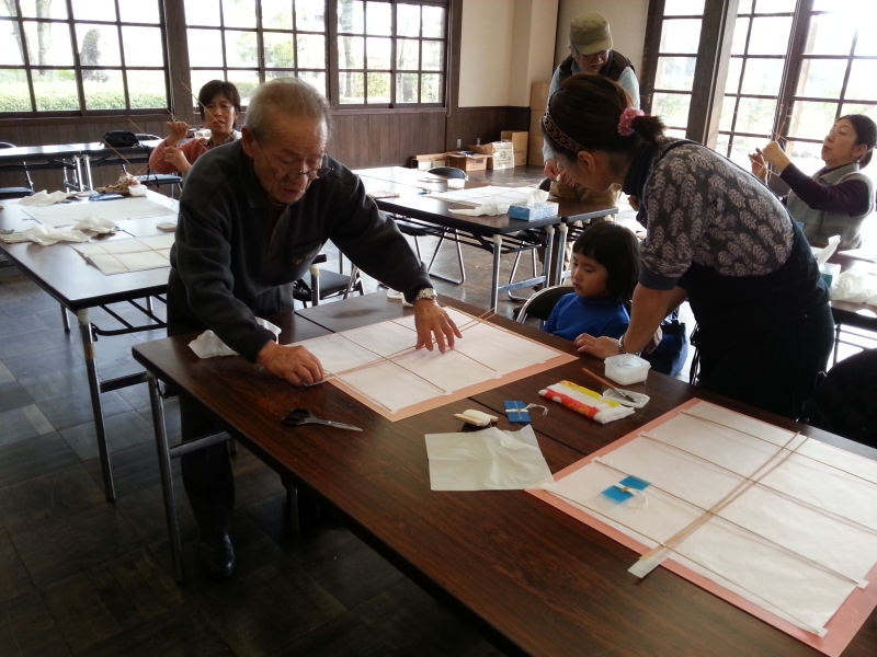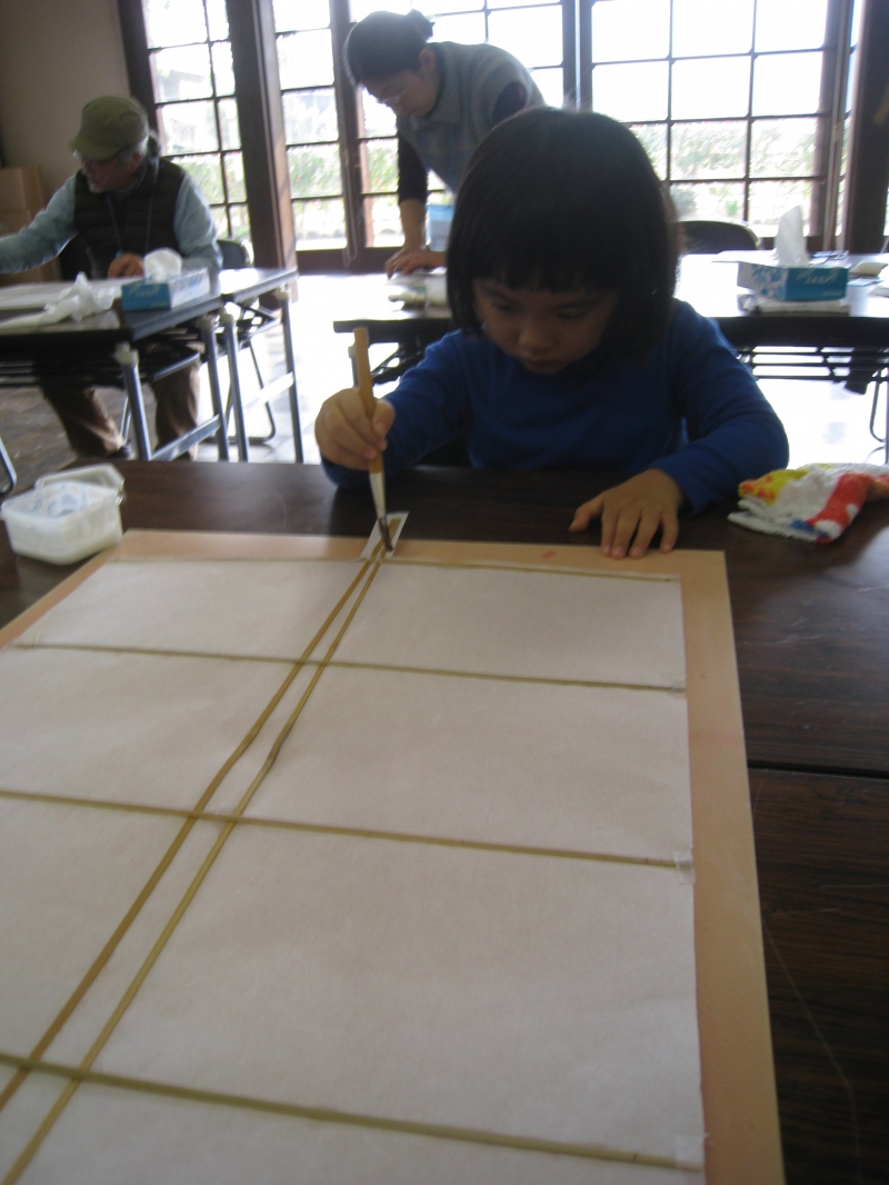 先生の丁寧な指導で繊細な大洲和紙を上手に貼り付けることができました。
