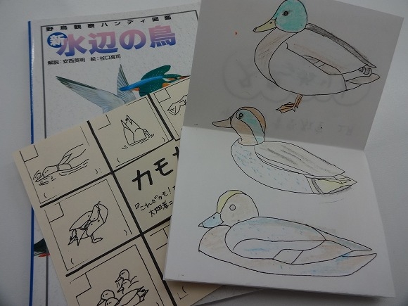 「水辺のとり展」を見ながら、まずはカモのイラストに「ぬりえ」をしました。