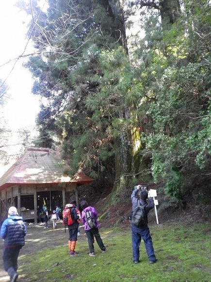 山から降り、公民館付近に帰り、天然記念物である三本杉を見学しました。