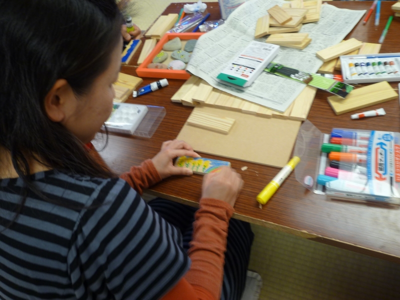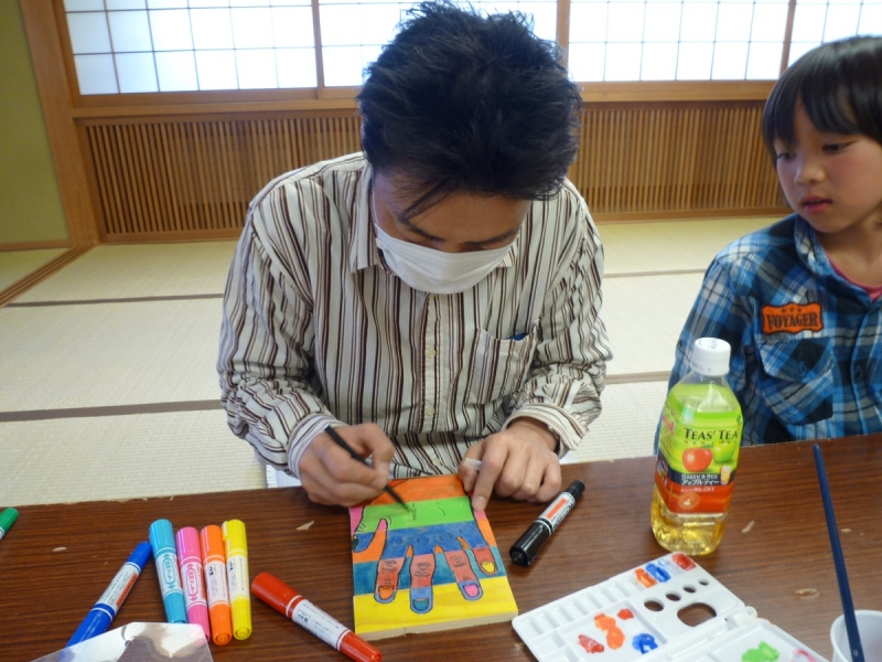 お話のあと、東北へ向かう方に託すかまぼこ板への絵を描かせていただきました。どんな絵が喜んでもらえるのか・・と、ただ絵を描くことに集中した時間は、東北の方へ生きる喜びを伝えたい気持ちとともに、自分を見つめ直す時間にもなりました。震災は、悲しい出来事ですが、起きてしまった悲しみの過去をどう受け止めていくかは、実際に震災に合った方達だけでなく、そのことを思うすべの人にとって必要なことで、そこからどう希望を持って進んでいくのか・・という事は、こうやってかまぼこ板に描いた絵を届けることのように、いろいろな人がかかわることで深まり、広がっていくのかなという事を感じました。