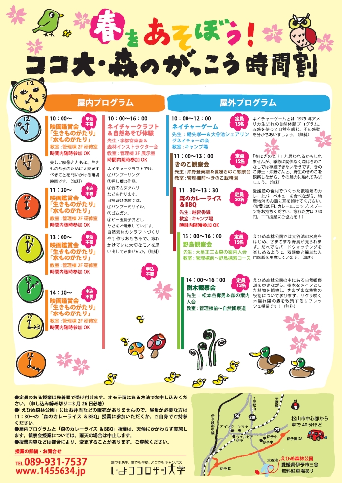 画面上部の”春をあそぼう!ココ大・森のがっこう時間割”画像をクリックすると、時間割がご覧になれます。