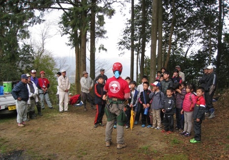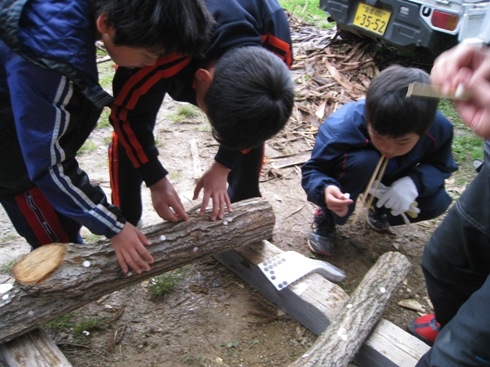 山奥組の人が用意してくれていた竹は、上が四角の窓で開き、その筒ごとに二合の米と水を入れていきました。この炊き方は初めての経験でした。箸も、竹で作りました。山奥組の方は子供に、小刀の当て方を向き角度など、丁寧に教えてくださいました。そして、切り倒した原木にどんどん穴をあけ、そこに子供たちがせっせとしいたけの菌を入れていきました。みんなで協力してたくさんホダ木を作り、運びました。その間もずっと、愛大の先生たちは枝打ちなどをしてツリークライミングをする木の準備をしてくれていました。
