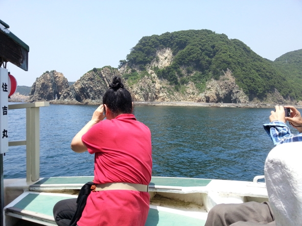 その後、待望のランチ・クルーズ。みかめ本館の朝井社長自ら案内してくださいました。リアス式の静かな湾内を、東京隅田川の屋形船と同形式の船で巡りましたが、須崎海岸など4億年前の花崗岩が褶曲しているさまなどから、地球の大地の動きが現在の環境を生み出し、さまざまな生きもののゆりかごとなっていることが感じられました。船内では、お弁当のほかに山口さんが提供してくださった「ハーブ媛ひらめ」のお刺身をいただきましたが、このようにおいしいお魚が育てられていることに、改めて感激しました。