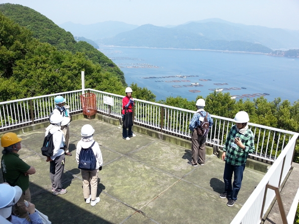 午前中、船から見た「寝観音」。そのまつげに当たる須崎観音に向かうと、本来は九州まで見える展望ということでしたが、晴れているのに残念ながら黄砂のせいで、そこまでの展望はありません。ガイドの宇都宮とみ子さんによれば、この地域は、かつては陸路より海路が便利で、遊びはもちろん、お医者さんも別府を利用したといいます。宇和海を挟んで、人々は行き来をしていたのです。ちなみに、この地域には「宇都宮」さんという名字の人が多いそうですが、これは伊予宇都宮氏の流れを汲むとか…。