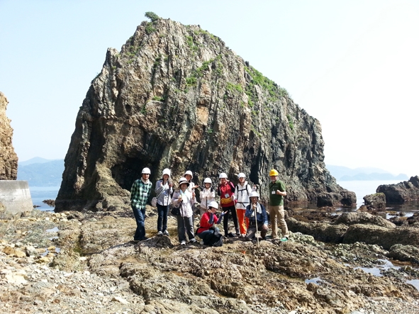 286段の階段を降りると、一挙に視界が広がりました。コンクリートの狭い遊歩道から見る磯は、ひじきが生えていたり、小魚が泳いでいます。「亀の手」や「ニシガイ」などの磯の生物も豊かです。切り立った崖や地元の方たちがマンモス岩と呼ぶ垂直の岩石の層でできた島は、かつてゴンドワナ大陸の時代に、現在のオーストラリアと同じところにあった4億年前の花崗岩を中心とする岩石だということです。