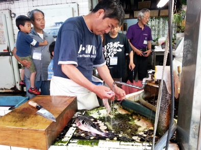 話につづいて、ハモの解体、フグの解体?のショーがあり、ちょっとショックを受けました。フグの解体は、まな板の上で身をくねらせているフグの鼻先を、いきなり包丁で叩き切り、途中で目(毒を含んでいるため)の部分を叩いて切り外します。そのあと3枚に降ろした中骨の部分が、しばらくピクピク動いているのには驚きました。「命を頂く」ことの現実を目の当たりにし、この最後の授業はこの日一番刺激的で、記憶に残りそうです。
