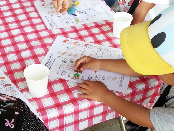 先生の松田さんが、今日のセミのぬけがら集めについてお話しされたあと、さあ出発。竜王公園の長い長いフジ棚の道を、セミのぬけがらを探して歩く。初めのうちは、みんなの目が慣れなくてなかなか見つからない。やがて、ひとつ見つけ、二つ見つけしているうちに、子どもたちは夢中で探しはじめる。探検隊の列が長く伸び、お母さんたちまでも、先に立ってぬけがらを集める。ぬけがらを入れたフィルムケースがどんどん増えてきた。