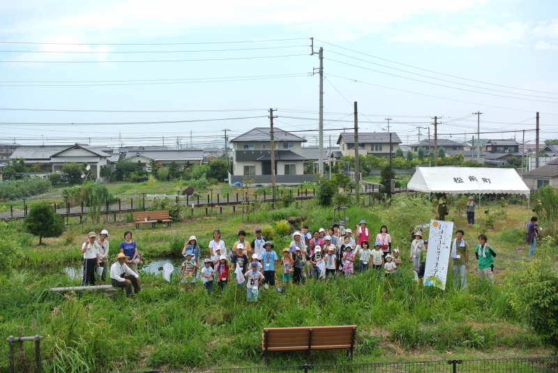 松前町が主催する「子ども環境学園」と共催で実施されたため、子ども環境学園の参加者を含め、大勢の方が参加していました。子ども達は草引きが終わると早速、網やカゴを持ってビオトープ内の池や小川に生息するメダカやドジョウ、バッタやトンボなどを観察。分からない生物がいると平井先生を尋ねては質問する姿が微笑ましたかったです。