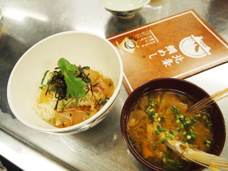 作り方を教わりながら、炊き上がったご飯の上の鯛の身をほぐして混ぜ込んだ鯛めしをお茶碗によそい、その上に醤油で漬けにした鯛の刺身を載せ、大葉、きざみ海苔、三つ葉で彩を添え、さらに刺身の残りのアラで作った味噌汁(味噌は中村先生の手作り!)とセットで「北条鯛めし定食」が完成。