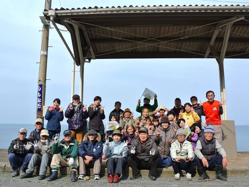 JR下灘駅に到着すると、待っていたのは地元の老人会の皆さん。