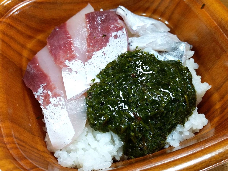小学生の可愛らしい生徒さん2人と共に、計7人での受講。三崎漁業協同組合の阿部さんから、あかもくについてやあかもくの調理の仕方を学び、お刺身の切り方までレクチャーを受けました。最後には、ご飯の上にあかもく・太刀魚・ハマチ・さざえを乗せた海鮮丼を食べることができ、大変満足度の高いイベントでした。