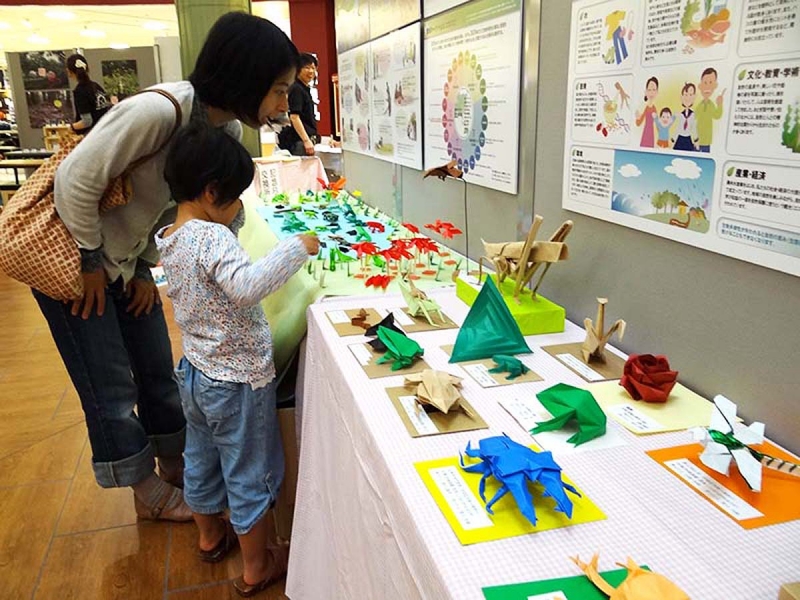 2014年でも行なった「折り紙」授業は、生物多様性のシンボルが折り紙で折られているからです。先生は前回も登場してくださった宮川さん。授業予定時刻よりも1時間ほど早く来られた宮川さん、会場の隅でモゾモゾと折り紙をおり始めます。すると、何かを感じた子供達が近づきます。その子供達の後に保護者が続きます。すると、アッ!という間に人垣ができて、授業時間前から授業がスタート(オープンな公開授業だったので問題ありませんでした)